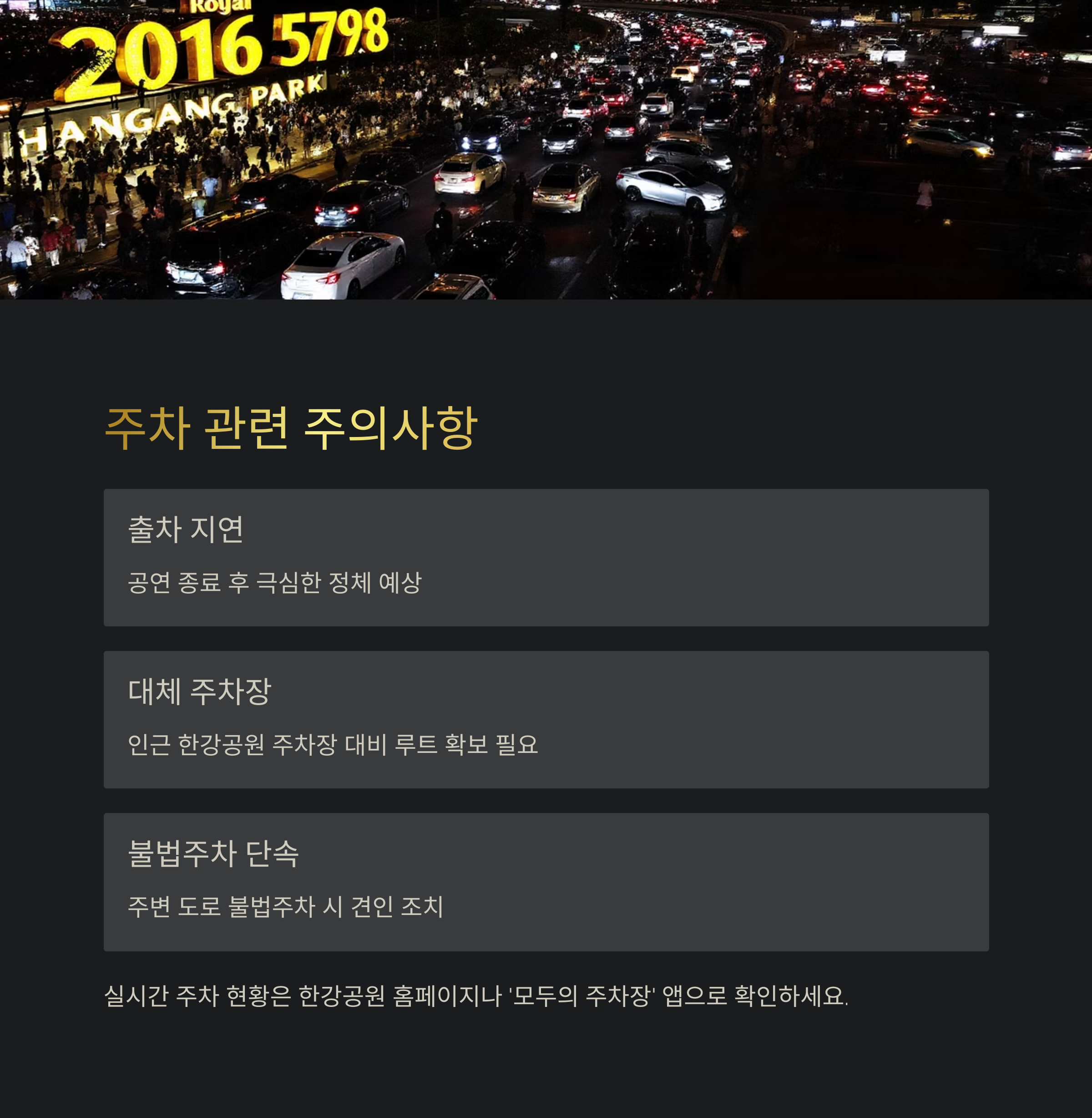 - 인근 한강공원 주차장 대비 루트 확보 필요