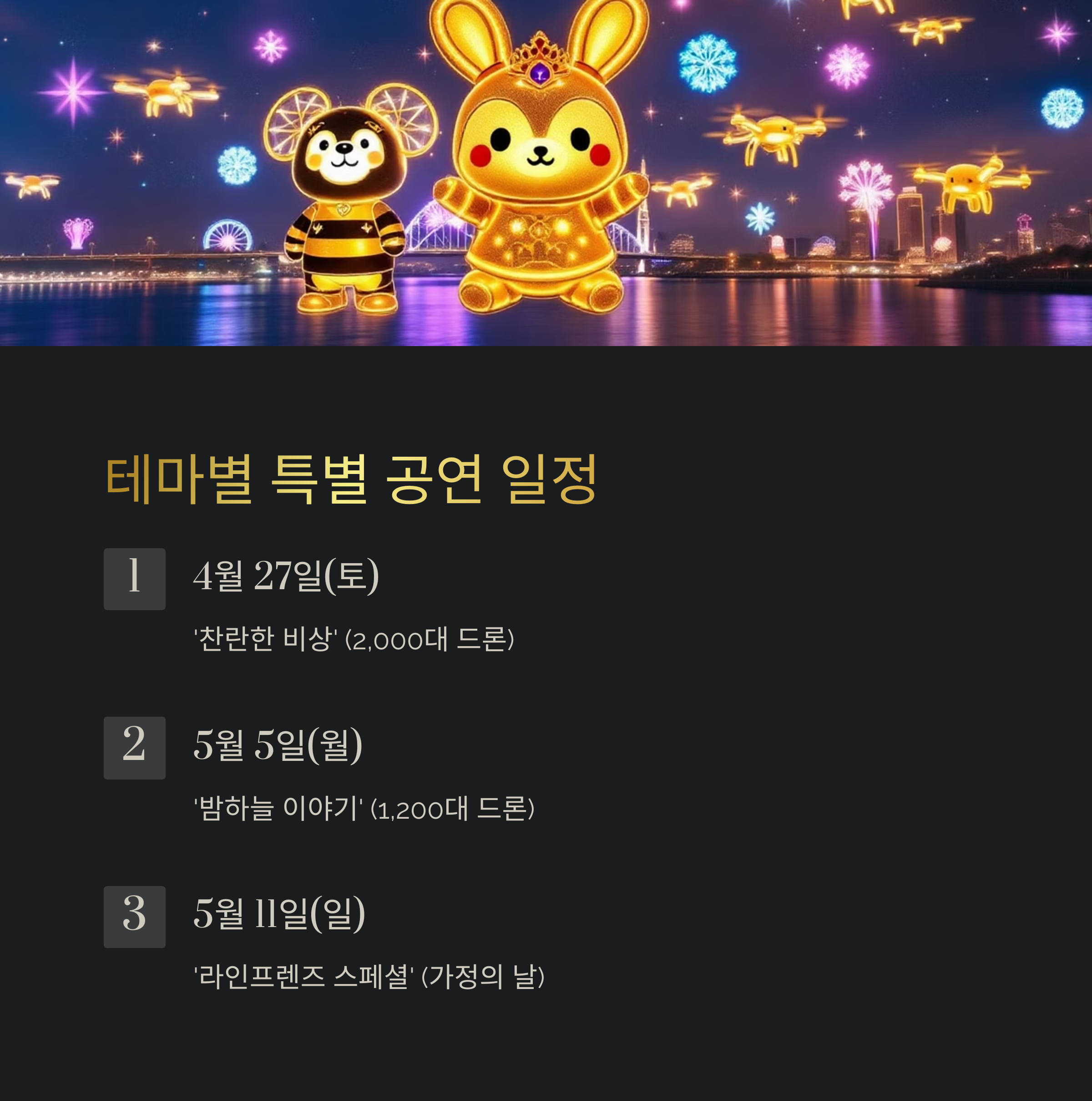 - 무료 관람 : 한강 드론쇼는 누구나 별도의 예매 없이 자유롭게 관람할 수 있습니다.