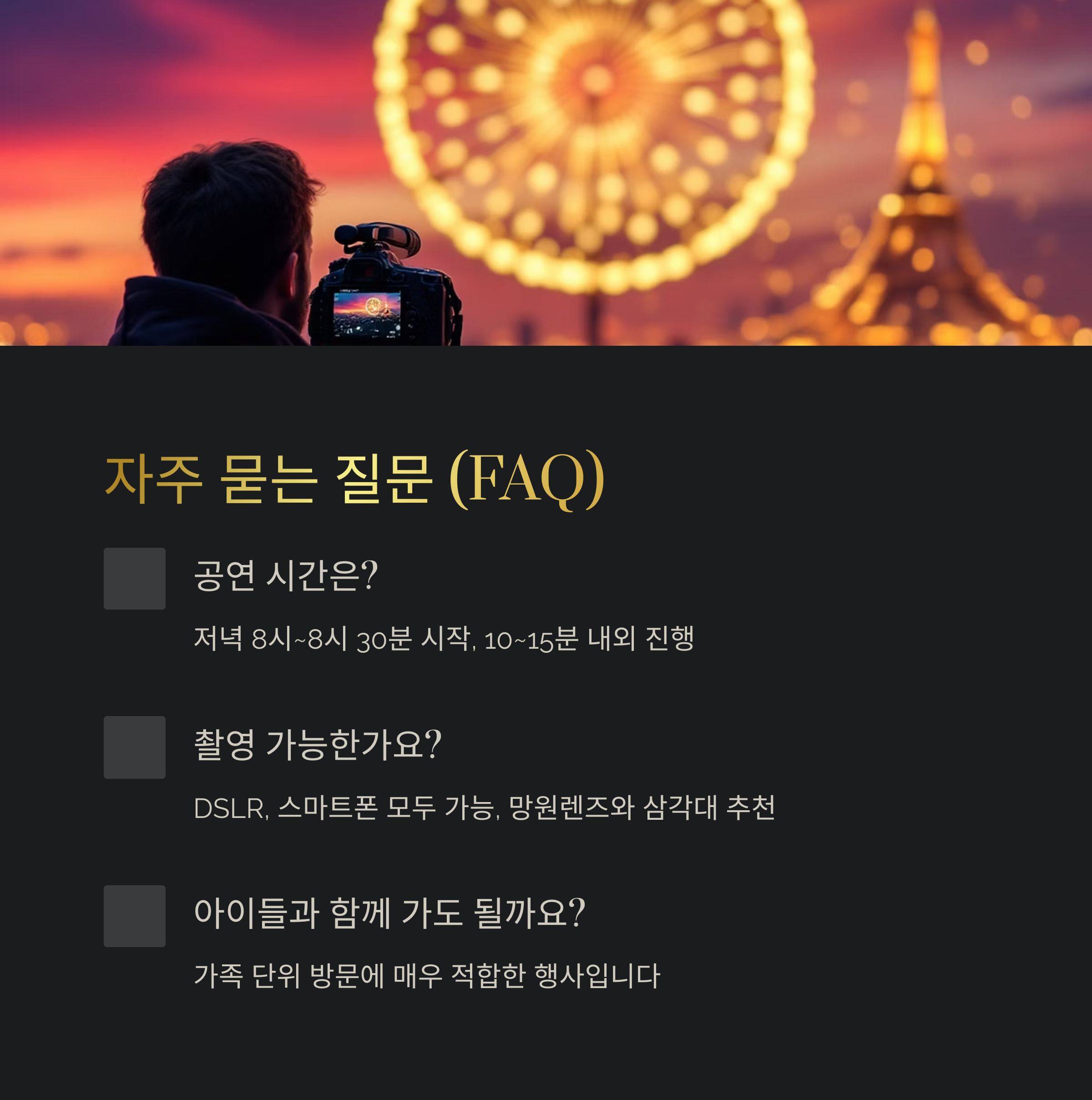 - 기상 조건 확인 필수 : 우천, 강풍 등 기상 악화 시 공연이 연기되거나 취소될 수 있으므로, 당일 공식 홈페이지 또는 SNS를 통해 공지사항을 꼭 확인하세요.