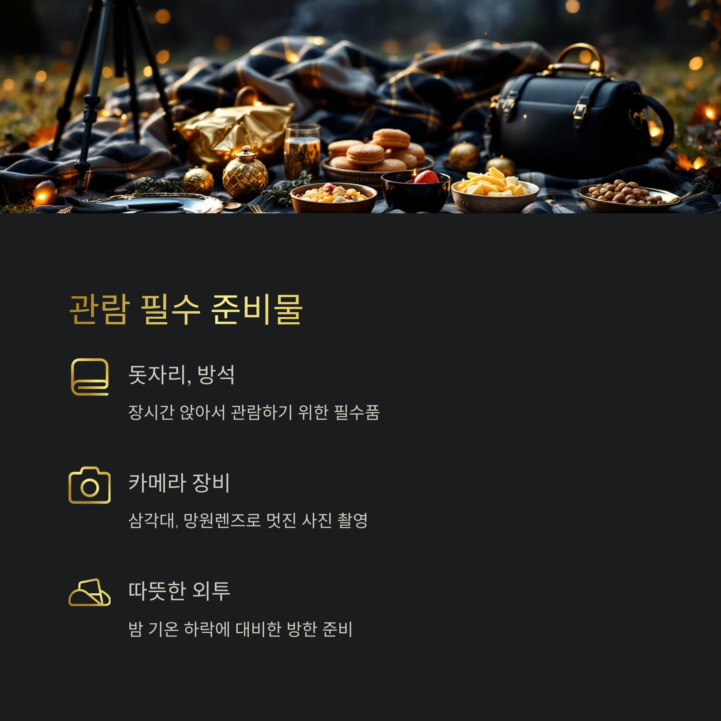 - 소지품 준비 : 밤에는 기온이 내려갈 수 있어 따뜻한 외투, 손전등, 간식, 휴지 등도 함께 챙기면 유용합니다.