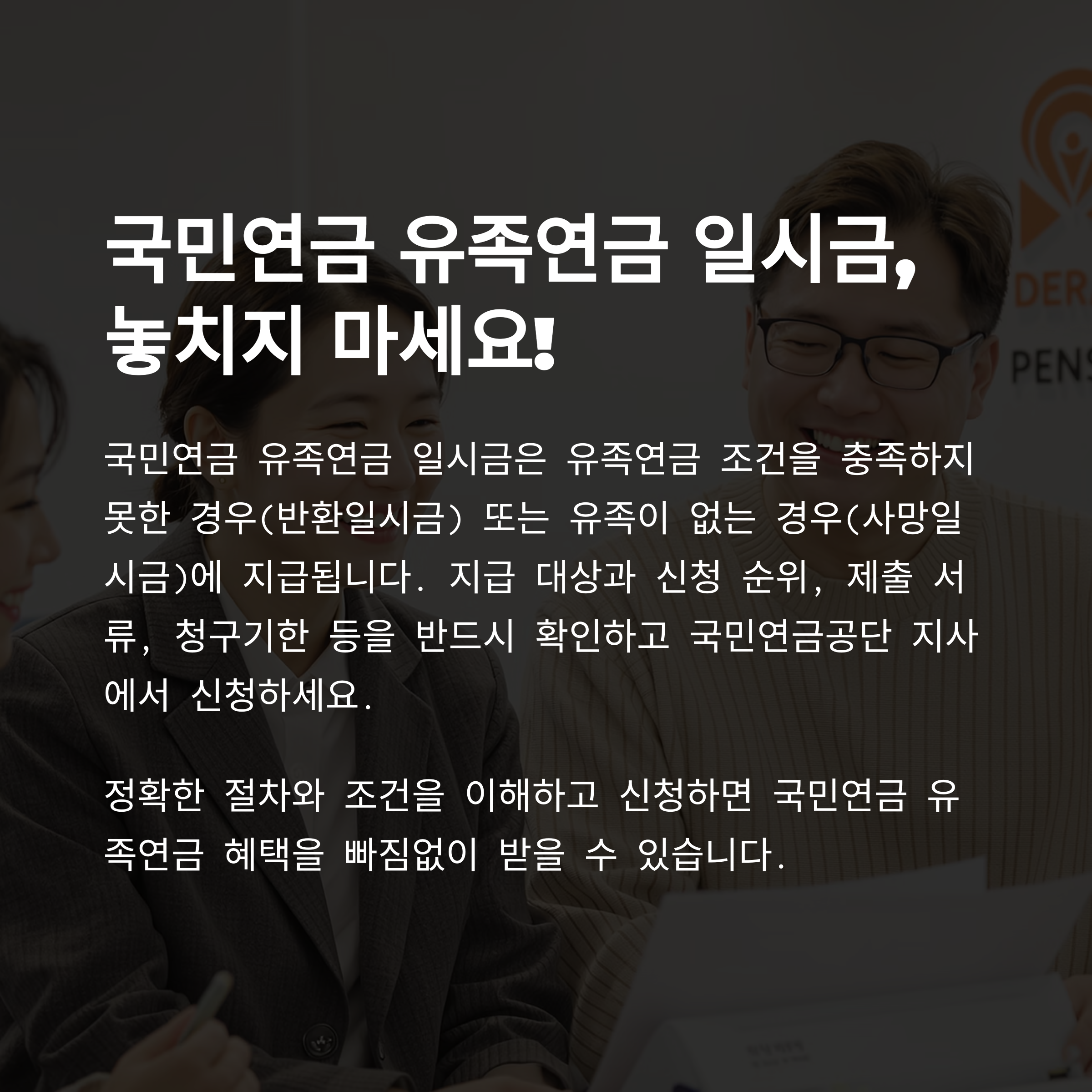 국민연금 유족연금 일시금은 유족연금 조건을 충족하지 못한 경우(반환일시금) 또는 유족이 없는 경우(사망일시금)에 지급됩니다. 지급 대상과 신청 순위, 제출 서류, 청구기한 등을 반드시 확인해야 하며, 국민연금공단 지사에서 신청이 가능합니다. 정확한 절차와 조건을 이해하고 신청하면 국민연금 유족연금 혜택을 빠짐없이 받을 수 있습니다.
