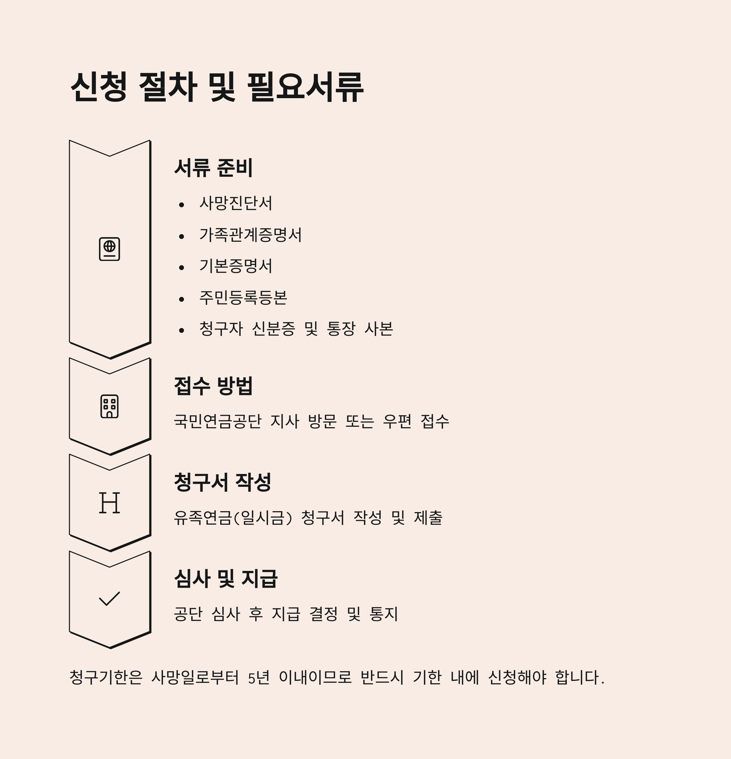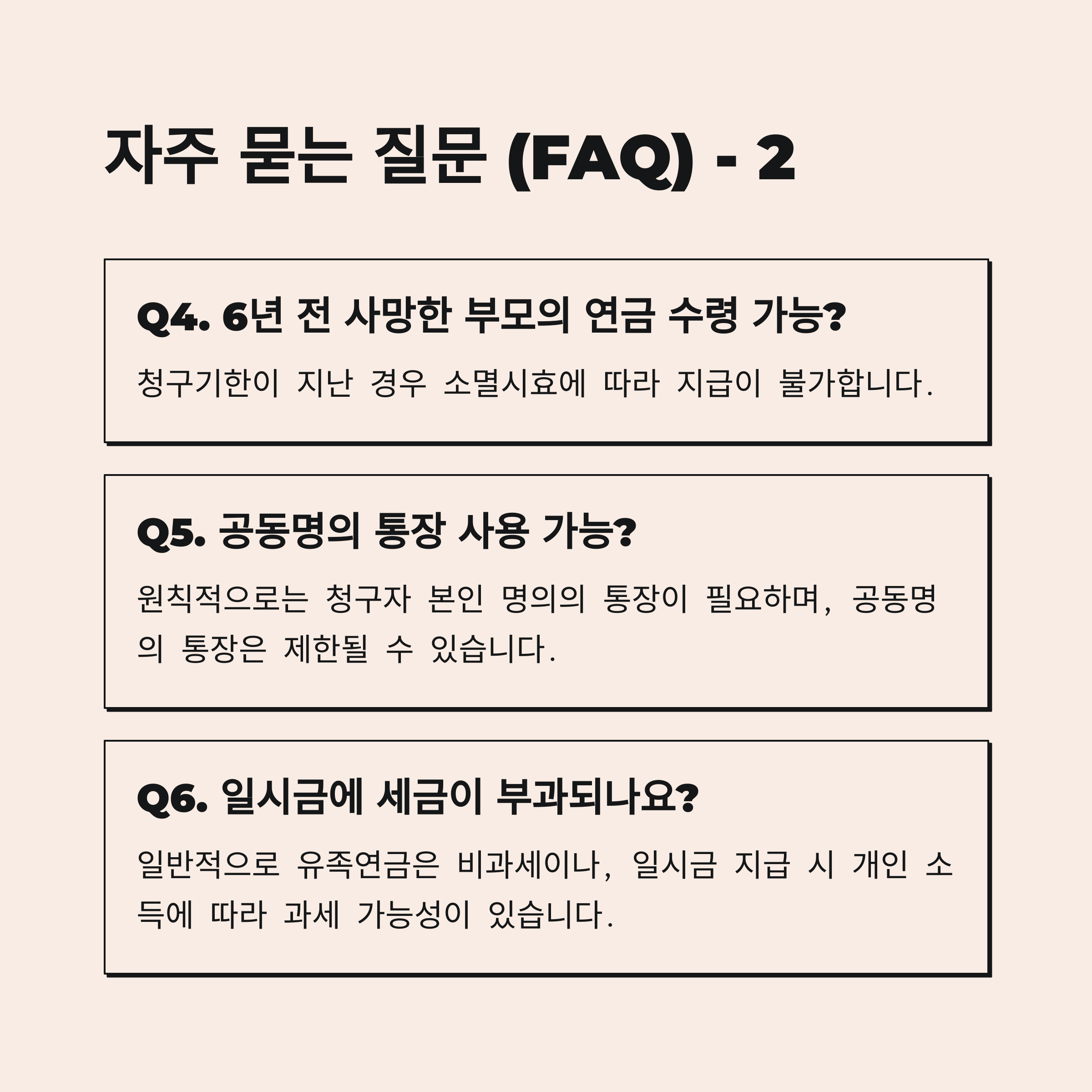 - 유족연금은 청구일로부터 최근 5년분만 소급 지급됩니다.