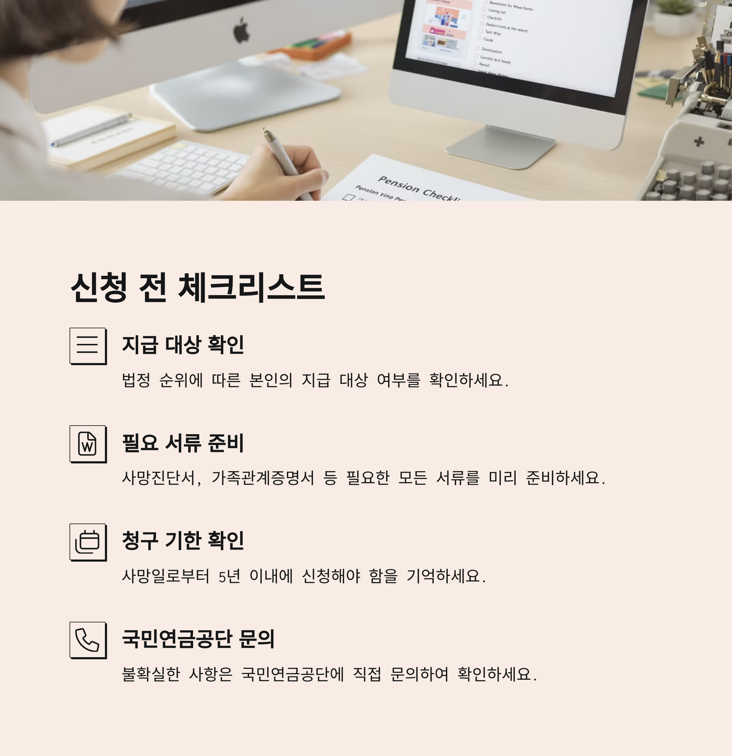 지급은 순위에 따라 상위 대상자가 없을 때에만 다음 순위자가 청구할 수 있습니다. 국민연금 유족연금 반환일시금은 이와 같은 법적 순위 기준을 반드시 따라야 합니다.