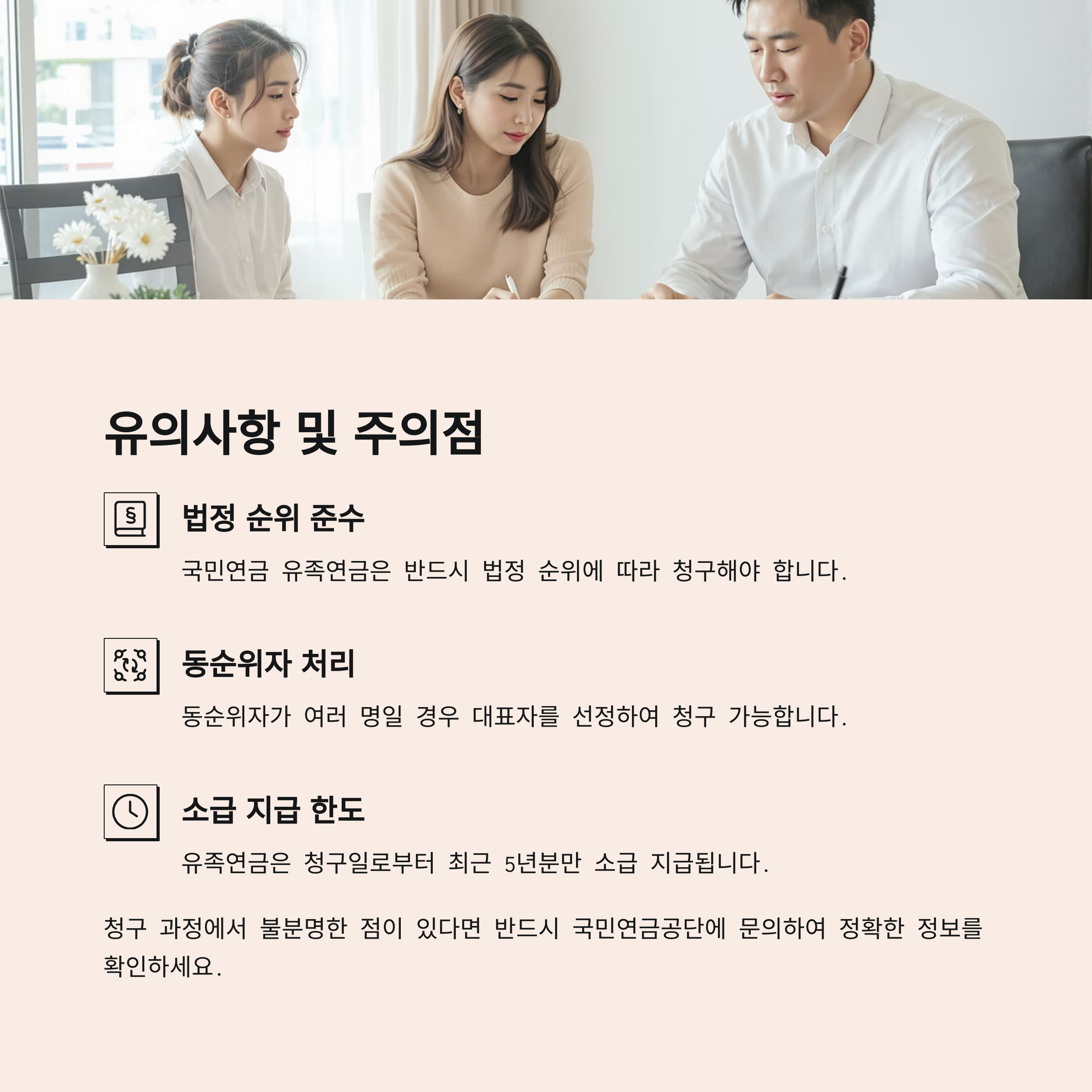 - 국민연금 유족연금은 반드시 법정 순위에 따라 청구해야 합니다.