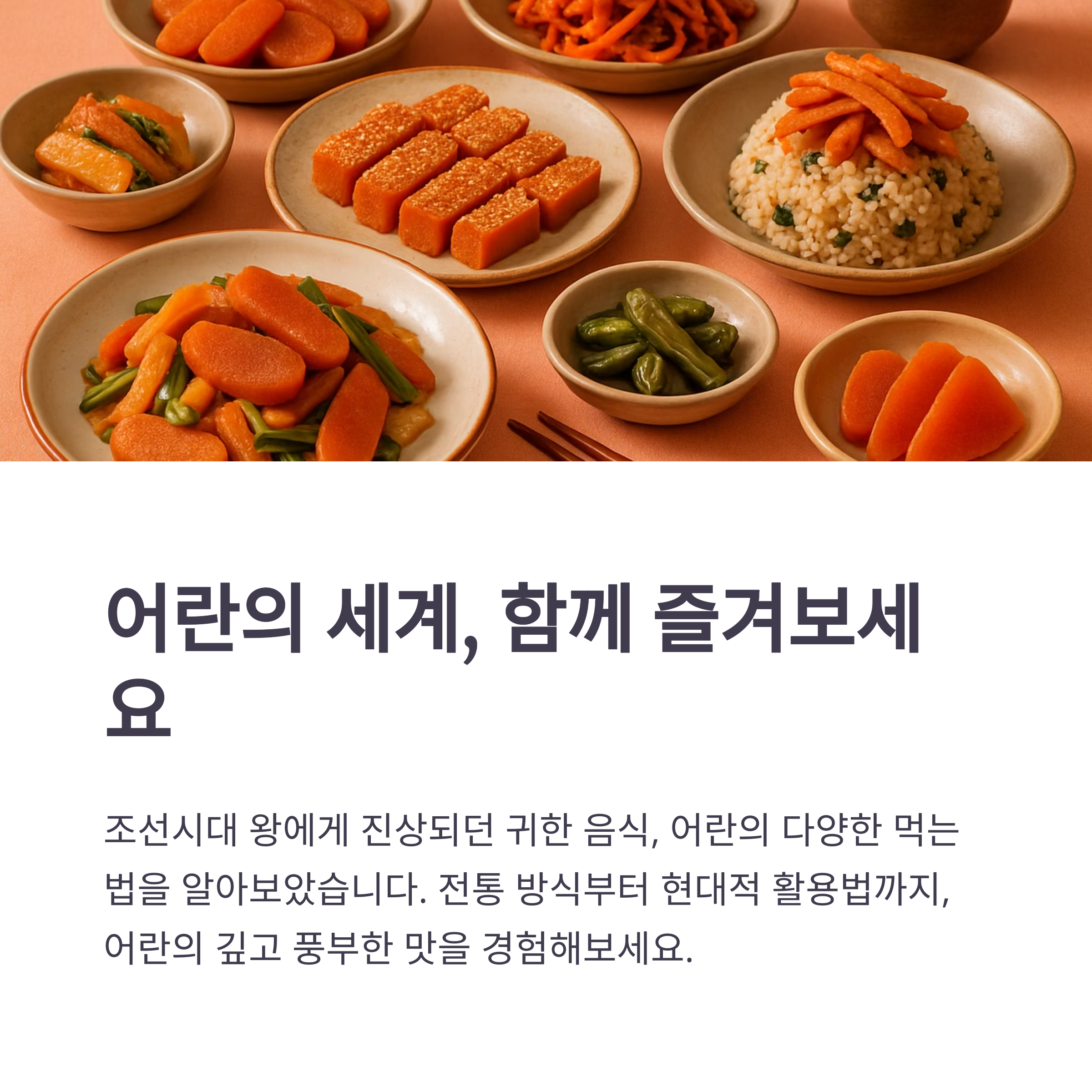 짭조름하고 고소한 풍미로 사랑받는 어란은 그 자체만으로도 훌륭한 미식입니다. 어란은 숭어, 민어, 대구 등의 알을 절여 건조한 고급 식품으로, 조선시대 왕에게 진상될 만큼 귀한 음식이었습니다. 이번 글에서는 어란 먹는법을 전통 방식부터 현대 요리 활용까지 다양하게 소개합니다.