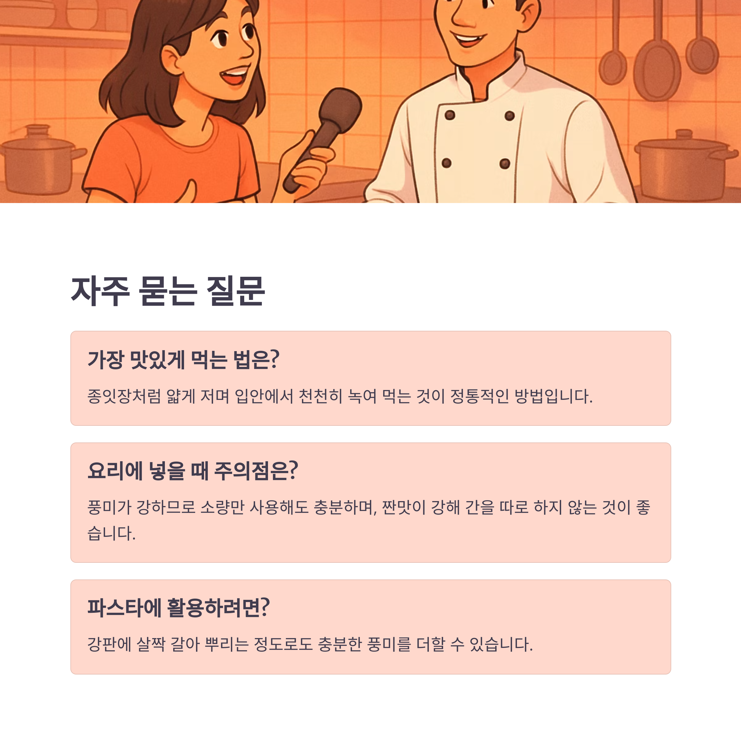 A. 어란은 풍미가 강하기 때문에 소량만 사용해도 충분하며, 짠맛이 강하므로 간을 따로 하지 않는 것이 좋습니다. 파스타나 샐러드에 활용할 때는 강판에 살짝 갈아 뿌리는 정도로도 훌륭합니다.
