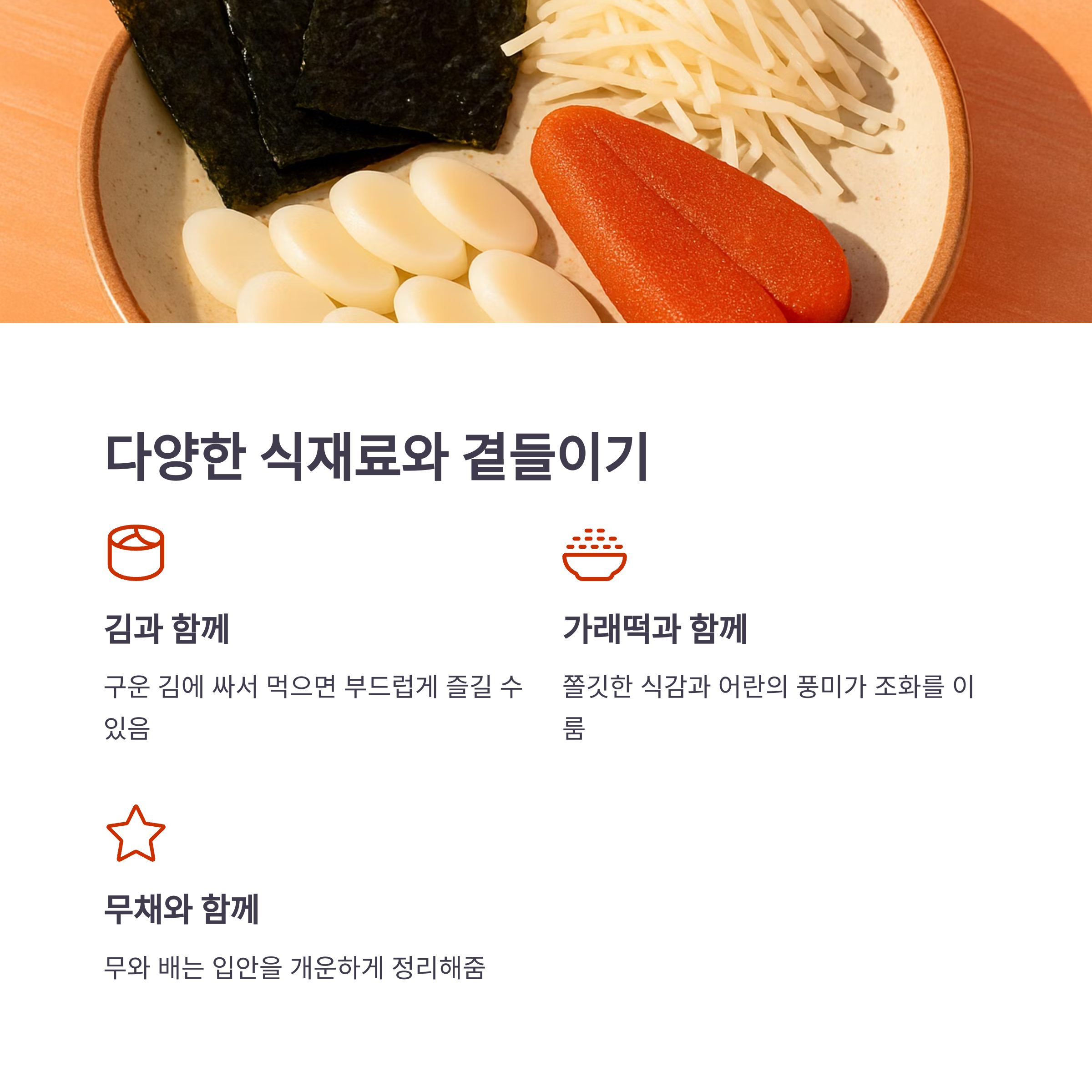 김, 가래떡, 무 등과 곁들여 먹으면 짠맛이 중화되어 담백하고 고소한 맛이 살아납니다. 특히 구운 김에 싸서 먹는 방식은 어란의 풍미를 부드럽게 감싸주어 부담 없이 즐기기 좋습니다. 무채, 배와 함께 먹으면 입안을 개운하게 정리해줍니다.